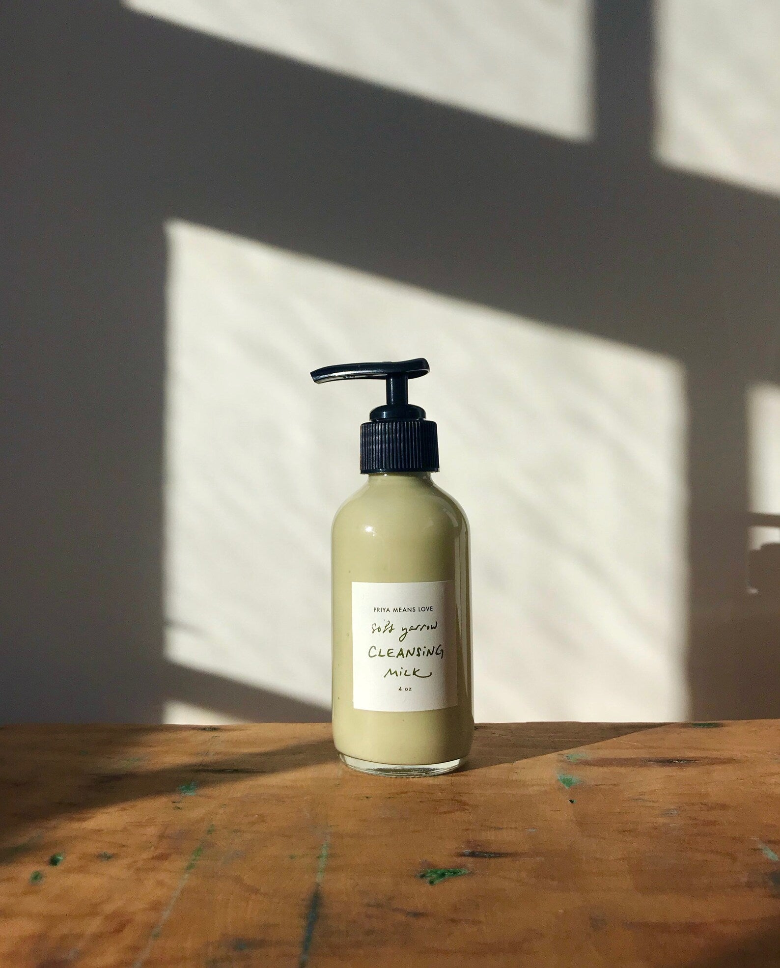 A soft gentle facial cleansing milk suitable for sensitive skin, with soothing, skin-refreshing herbs. Think of this as an oil cleanser that rinses off easily, with the purifying and soothing benefits of bentonite clay, chamomile, yarrow, and rosalina.